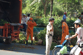 Photos: Bridge to small island in lake of Old City Hanoi. A day trip which requires a two hour drive out of Hanoi brings us to a place referred to as 'Halong bay without the water,' which is more karst formations having a 3 kilometer canal running thru them, which tourists are paddled along in a genuinely serene and lovely tour. Our guide was trying to tell us some history while standing in front a water buffalo in its tiny pool of water/mud with face even Joan Rivers would envy. This flower seller on a bike in Hanoi actually shows the area behidn that should be sidewalk, but it is covered in motorbikes and merchandise, so pedestrians have to dodge traffic to walk. Because Lunar New Year was a week away, flowers were for sale everywhere.